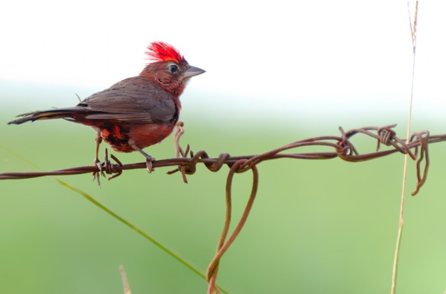 Medindo cerca de 13,5cm, tem tamanho semelhante ao do pardal, mas com coloração marrom escura na parte superior e vermelha nas partes inferiores e na cabeça, especialmente no macho, que apresenta uma coloração intensa e um topete vermelho com uma faixa negra. Ambos os sexos apresentam uma linha branca circundando os olhos. A coloração das fêmeas não tem tanto brilho e são mais pardacentas.